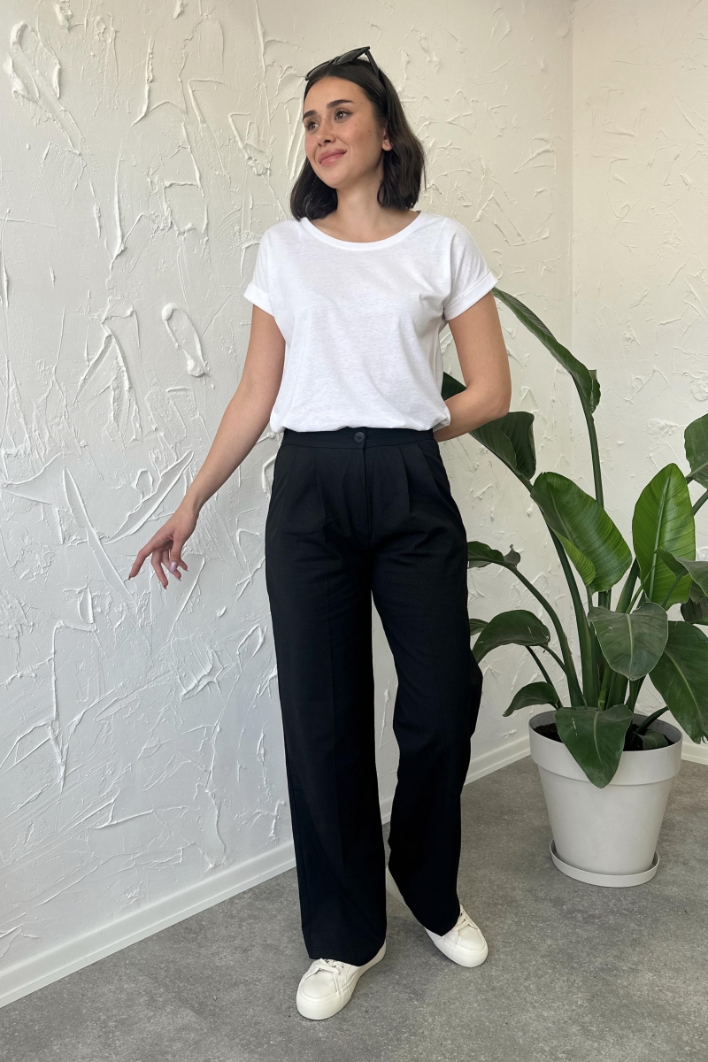 Krep kumaş kumaştan üretilmiştir. Pantolon boyu ortalama 105cm'dir. Pantolon önden çift pilelidir. Pantolon belden yarım lastikli ve fermuar kapamalıdır. Günlük hayatta rahatlıkla kullanabilirsiniz. Manken Ölçüleri: Boy 175cm, 63 Kilo, 38 Beden Modeldeki Ürün Ölçüleri: 36-38, Bel: 36cm, Basen: 53cm Ürün İçeriği: %50 Pamuk, %50 Polyester Ürün ölçülerinde birkaç cm yanılma payı olabilir. Ürün renklerinde konsept çekimlerinden dolayı ufak ton farklılıkları olabilir..